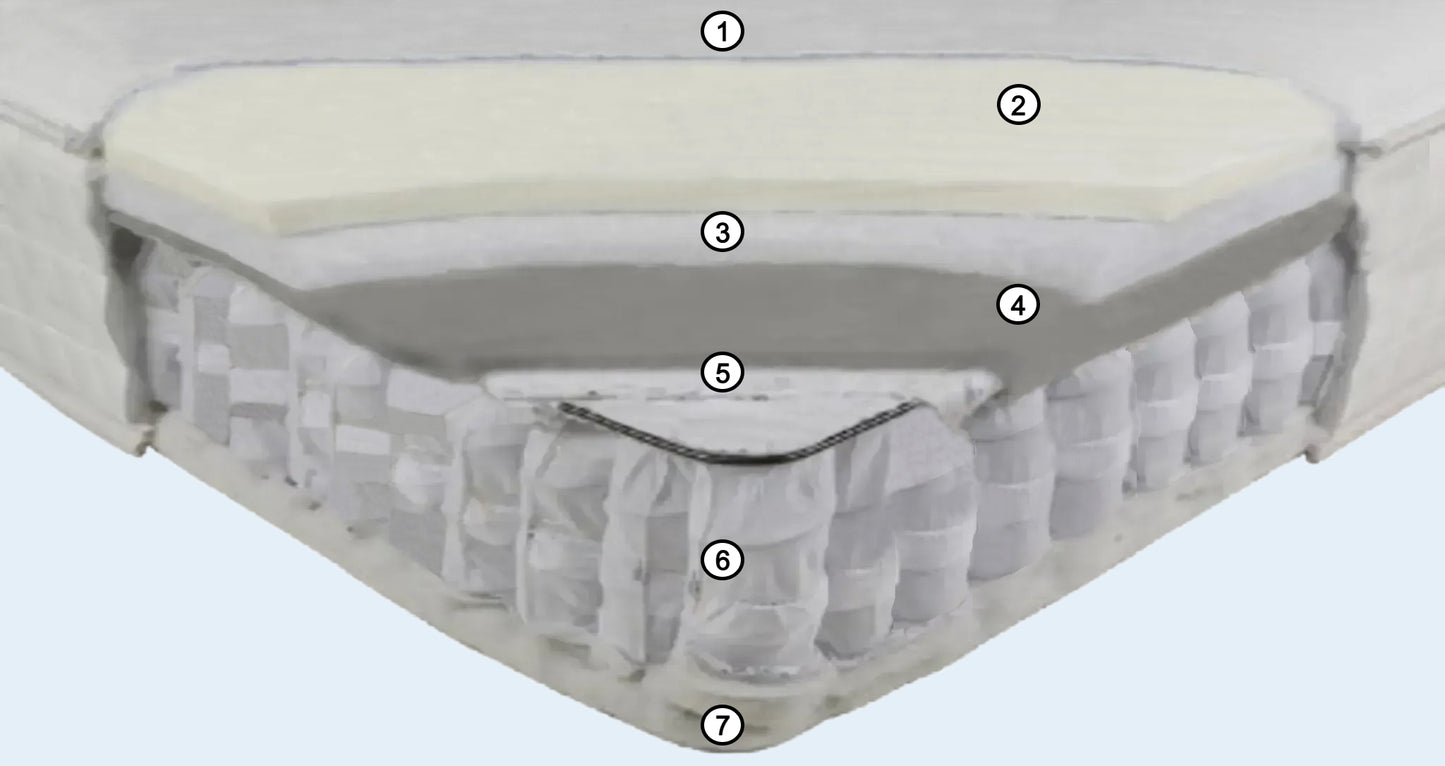 7 zone individually encapsulated, designed to provide precision support. Sleep right to the edge with no sag or dip with a wire edge tied in.
